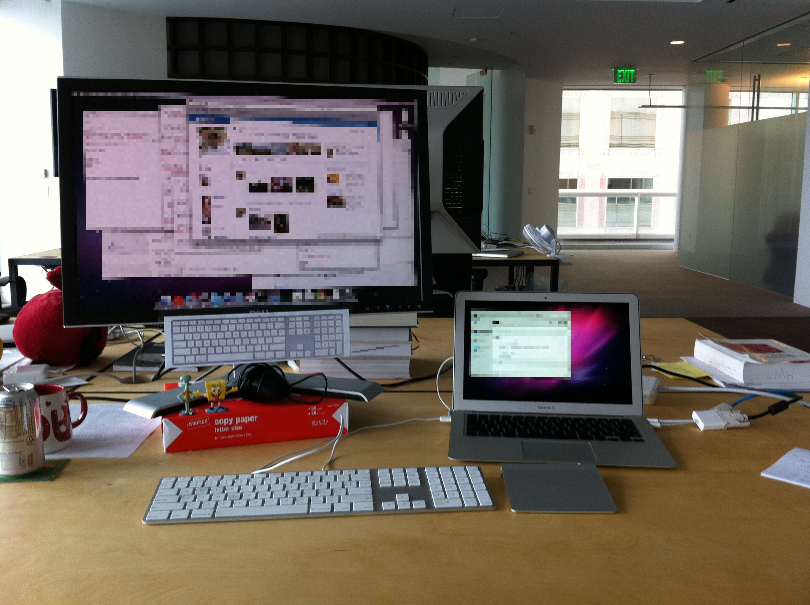Start-up life, part 1. The Apple keyboard is now accompanied by a "Magic" Trackpad, and we see a MacBook Air next to a decidedly-not-4K Dell monitor (to which is taped a picture of a US keyboard layout because my brain was trying to recover after being rewired when using Spanish layout keyboards). In a minor concession to ergonomics, the monitor is raised close to a suitable height by sitting on a ream of paper, but it's not centered in front of the keyboard, something I'd never tolerate now.